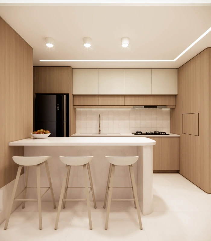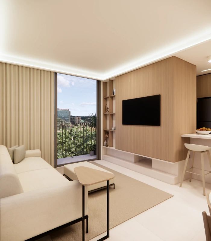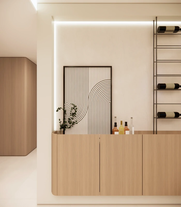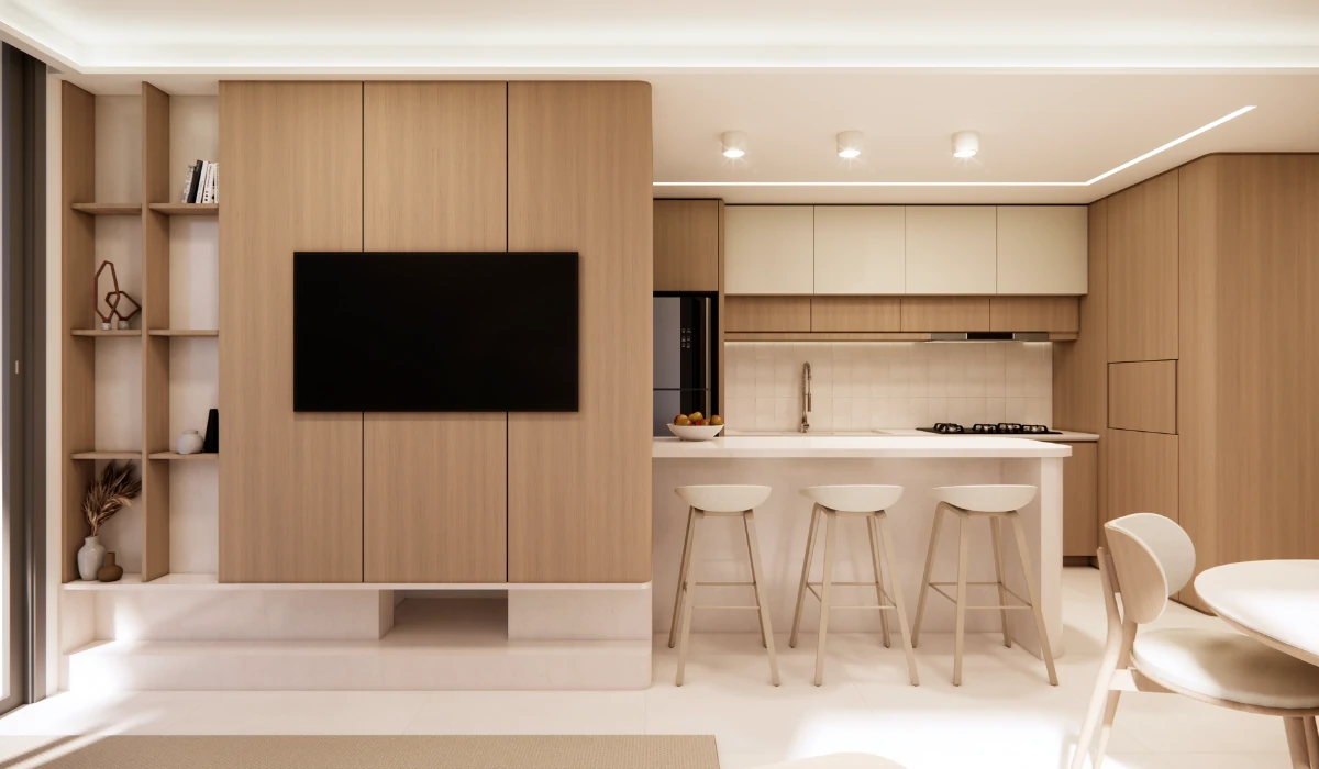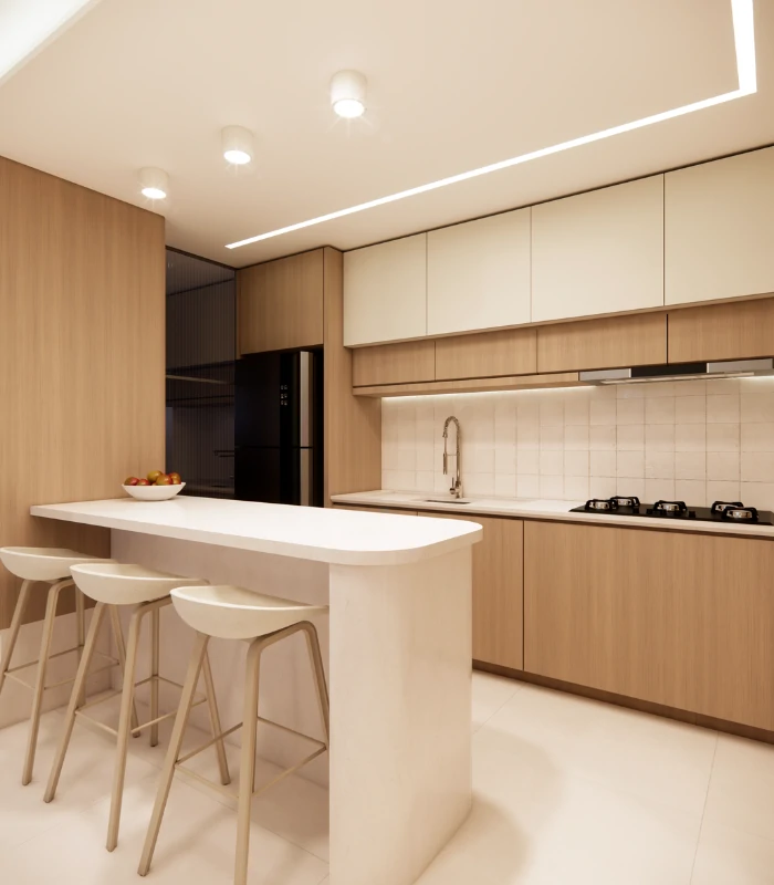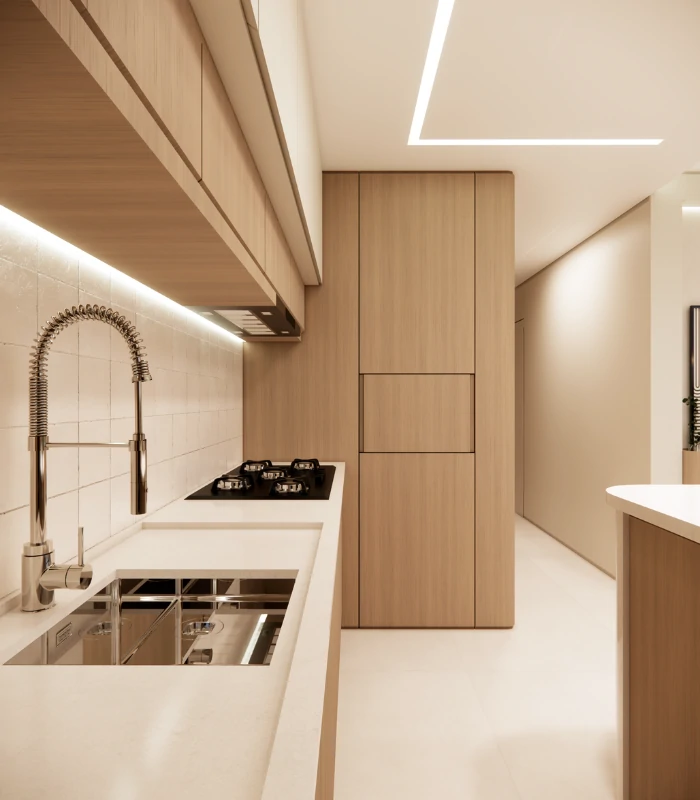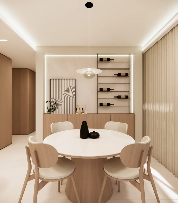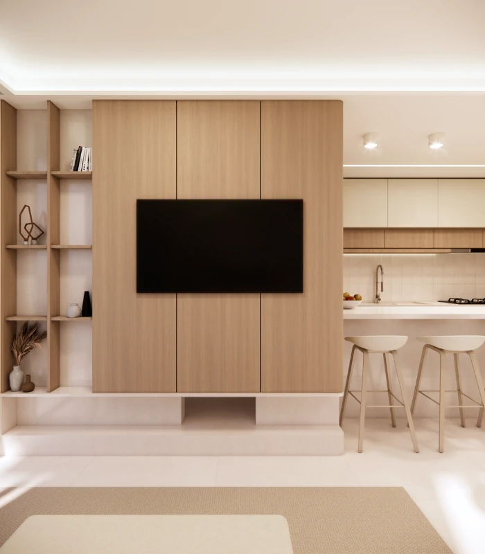 Neste projeto, o living foi concebido como um espaço integrado, elegante e funcional, capaz de refletir um estilo de vida contemporâneo. A marcenaria sob medida em tons amadeirados envolve toda a área social, criando unidade visual entre sala, cozinha e jantar, enquanto a iluminação delicada e os detalhes minimalistas trazem leveza e sofisticação ao ambiente. O layout valoriza a fluidez entre os espaços, tornando-os acolhedores e práticos para o dia a dia, mas também perfeitos para receber amigos com conforto e harmonia.