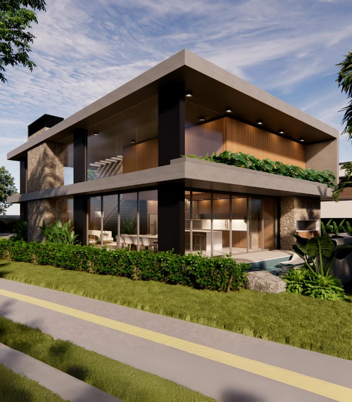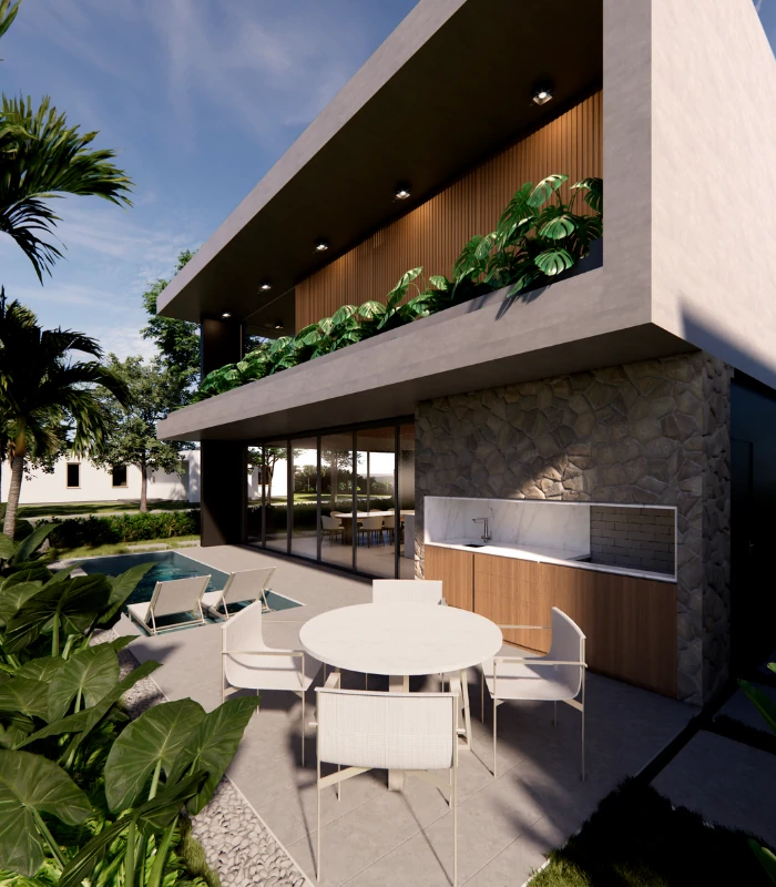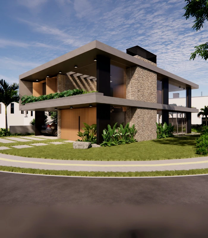Projetada para um lote de esquina em condomínio fechado, esta residência explora ao máximo a posição privilegiada do terreno, com linhas contemporâneas e volumes bem definidos que conferem imponência à arquitetura. A fachada combina concreto aparente, painéis amadeirados e detalhes em pedra, resultando em um visual elegante e atemporal. O paisagismo envolve a construção e se estende às sacadas por meio de floreiras, reforçando a integração entre interior, exterior e entorno natural. Uma casa que traduz personalidade, sofisticação e harmonia com a natureza.