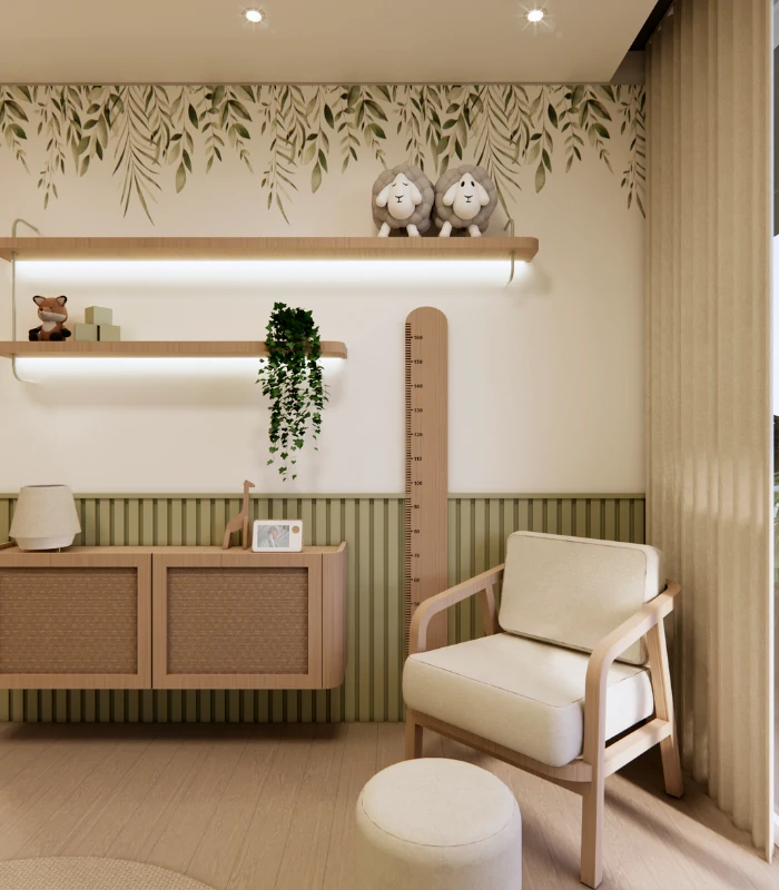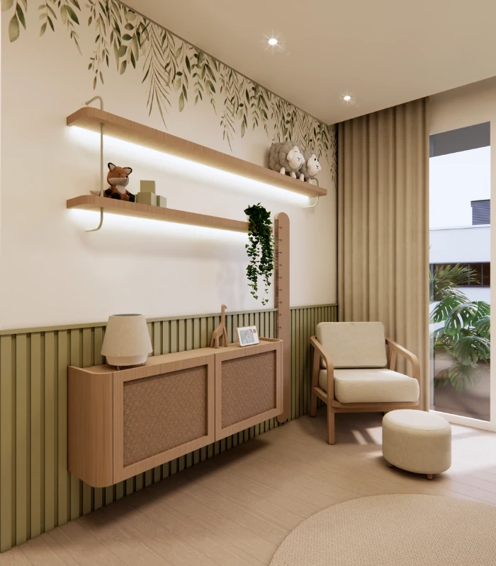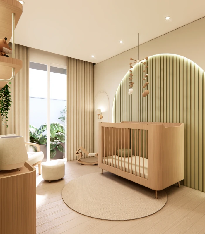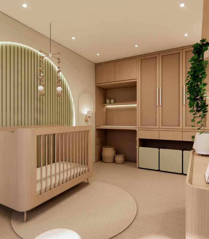 Este dormitório infantil foi pensado para acolher com delicadeza e tranquilidade. A paleta suave em tons neutros e verdes, junto à madeira clara, cria um ambiente leve e aconchegante. O arco iluminado valoriza o berço como destaque, enquanto a marcenaria funcional completa o espaço com praticidade e harmonia. Um quarto pensado para acolher e acompanhar o crescimento com ternura e sofisticação.